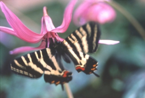 観察会配布資料より ≪2009. 4. 4≫ ◆ギフチョウの里 金山町 明治16年 4月24日(1883年)岐阜県郡上郡祖師野村地内(現在の下呂市金山町祖師野)において、岐阜市にある名和昆虫研究館の初代館長 名和靖氏(1857~1926)が一頭の見慣れないチョウを発見し、帝国大学(現在:東京大学)にて調査の結果、新種と解り、岐阜県にちなんで「ギフチョウ」と命名し発表されました。その後、各地で採集され、日本列島の本州(山口県から秋田県)のみに生息するチョウであることが解明されました。 ギフチョウが金山町で通常観察できるのは、4月初旬から中旬にかけてであり、年 1回の発生で、他のチョウに先がけ早春の野山に姿を見せることから、誰が名付けたのか「春の女神」「春の舞姫」などと呼ばれています。春の暖かい日に、花の蜜を吸うため、サクラやスミレ、カタクリなどを訪れます。 ギフチョウが卵を産み付ける場所は、カンアオイという植物で、その葉の裏に直径約 1mmの真珠のような卵を産みます。そして卵から孵(かえ)った幼虫はカンアオイを食べ、5回の脱皮とともに成長し、6月頃蛹(さなぎ)になり翌年の 4月頃まで枯れ草や、枯木の下で蛹のままじっとしています。しかし、近年、造林や開墾などにより従来ギフチョウの住む照葉樹林(雑木林)が減少し、それに伴い食草となるカンアオイの激滅と共にギフチョウも減少しています。 ギフチョウの保護が叫ばれ、各地では対策がとられていますが、自然の中での生態系を崩すような誤った対策がとられると絶滅することがあります。 また、ギフチョウは発生場所において羽の模様が異なり、特に進化や地域性を調べることがなされています。そのため、発生地以外のギフチョウを放したりしないことが大切です。 その対策の一つとして、金山町では保護地区を設け、食草の増殖、吸密植物の保護、間伐、下刈りなどの環境整備を行い、毎年 4月にはギフチョウ観察会を開催し、町民に「春の女神」を紹介して、ギフチョウとの出会いを大切にしています。 ◆カンアオイ カンアオイはウマノスズクサ科の多年生草本の植物であり、本州に15種が分布し、その中で金山町に分布しているものは、ヒメカンアオイという種類です。 カンアオイは、ギフチョウの食べる植物ですが、カンアオイなら何でも食べるというわけではなく特定の種類のみです。また、カンアオイは昔から知られており徳川家の紋章(葵の紋)は、カンアオイの仲間のフタバアオイを型取っています。 カンアオイの成長は大変遅く、1年に 1cmくらいしか分布しなく、花がつくまでに、数年から10年くらいかかります。また、花は地上すれすれに咲くので種もせいぜい 1cm以内にしか飛散しなく、他の植物と違い広範囲に増えることはありません。 カンアオイは、通常、照葉樹林(雑木林)内に分布しています。金山町ではスギ、ヒノキの植林が進み、現在見られるところは陽の当たる林縁のみです。また、針葉樹の植林地では陽が当たらないことからしだいに細くなりなくなってしまいます。 植林鉢でも育成しますが、条件が合わないと数年で無くなってしまうことがあるので日照時間、水分補給に注意しなければなりません。 【参考】 カンアオイは強い日差しを嫌います。朝に陽が当たり、昼の日差しを遮り木陰のある庭が最適です。また、水は適度に与え土壌が乾かないようにしてください。いつでも移植することは可能です。しかし、皆さんが心配されることは、植えても大きくならない、いつまでも葉が出てこないことだと思いますが、カンアオイは年 1回(通常 4月)の発芽であり途中には葉は出てきません。また、早く大きくしようと肥料を多く入れると枯れてしまいますので注意してください。 カンアオイは金山町全土に分布していますが、もっと育ててみようと野山へ行って採取しないでください。なぜならば、そこにギフチョウが生息していれば、カンアオイを採ることにより食草が無くなってしまいギフチョウが絶滅する危険性があります。もし、野山でカンアオイを見つけたならば専門の人に聞いてから採取してください。 |