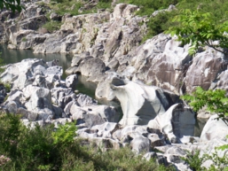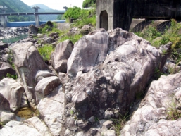 七宗ダム閘門下には、飛騨川流域に沿って約 500m の区間に特異な岩石が露出しています。白亜紀末期 (約 6500 万年前) 高温の火山灰が貫流し、周りの礫 (主に濃飛流紋岩) を巻き込んで凝固した石英斑岩です。その後飛騨川の流れによる侵食をうけ、地表に露出しており、地質学的に珍しい場所。愛宕山付近の地質は秩父古生層、田島付近は石英斑岩で、七宗ダム下流地点は両方の地質の境目に当たっています。 〔金山町の地質〕 金山町の八坂から中切、中津原、金山地区(井尻)を結ぶ線の以西の地質は、秩父古生層と呼ばれる堆積岩層(チャート・粘板岩・砂岩の互層)で、古生代二畳紀(今から 2 億 4 千万年前に堆積したもの)です。それに対し以東の地質は濃飛流紋岩と呼ばれる火成岩が貫入したもので、金山町はこれらの接点に位置しています。