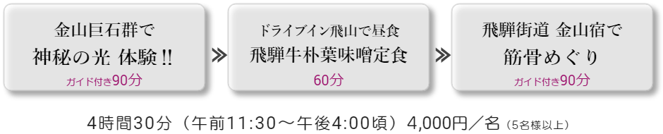 ※巨石群ガイドのみ をご希望の方は、金山巨石群リサーチセンター (TEL. 0576-20-4118) へお申し込みください。
