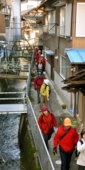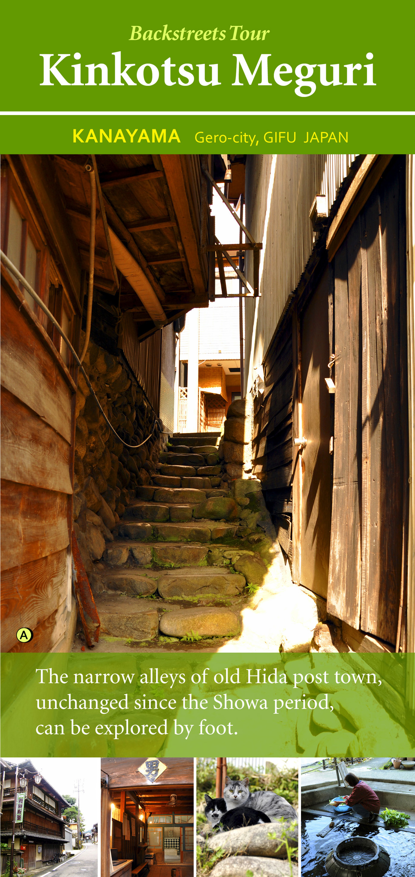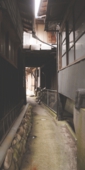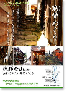 「筋骨」は筋(すじ)と骨(ほね)と書くように、人間の体に例え、複雑にからみ合ったせまい道のこと を言います。飛騨街道 金山宿には、建ち並ぶ民家の隙間に筋骨が張り巡らされています。現在でも集落の往来に近道として役立つ筋骨は、住民にとって欠かせない存在です。観光客にとっては慣れない土地のせまい道は入りにくいものですが、公道なので誰でも通ることができますが、迷路のようになっていますから、迷ってしまったらご近所の方に尋ねてみて下さい。昭和ののどかな風景を探検気分で味わってみてください!