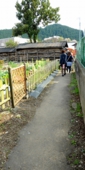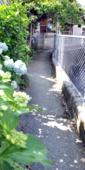(2) 信号「上市場」を渡ると右側に ガソリンスタンドがあります。 そのまま直進し、右側の車庫手前の脇道の筋骨を入ります(右折)。まもなく 子守地蔵とこちょこちょの木 が左手にみえ、通り過ぎてしばらく直進します。途中、左の筋骨を抜けると、「餅倖(もちこう)」 に突きあたります。